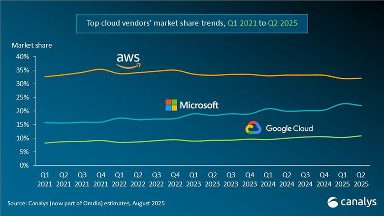 According to Canalys (part of Omdia), global spending on cloud infrastructure services reached US$95.3 billion in Q2 2025, up 22% year on year. Market momentum remained stable, with year-on-year growth exceeding 20% for the fourth consecutive quarter. Cloud demand increased due to AI consumption, revived legacy migrations and cloud-native scale-ups. As hyperscalers advance their AI capabilities and applications, more customers are adopting multi-model approaches to meet specific cost and use-case requirements. In Q2 2025, AWS, Microsoft Azure and Google Cloud retained their rankings from the previous quarter, with their combined market share accounting for 65% of global cloud infrastructure spending. Collectively, customer spending with these three hyperscalers increased 27% year on year.