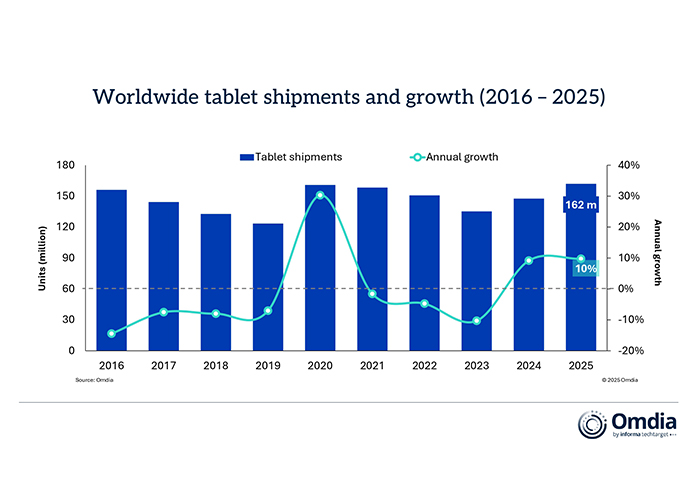 The global tablet market continued its recovery in 2025, with shipments rising 9.8% year on year to 162 million units according to the latest research from Omdia. Momentum was strongest in the holiday quarter, with Q4 2025 shipments reaching 44 million units, up 9.8% year on year.