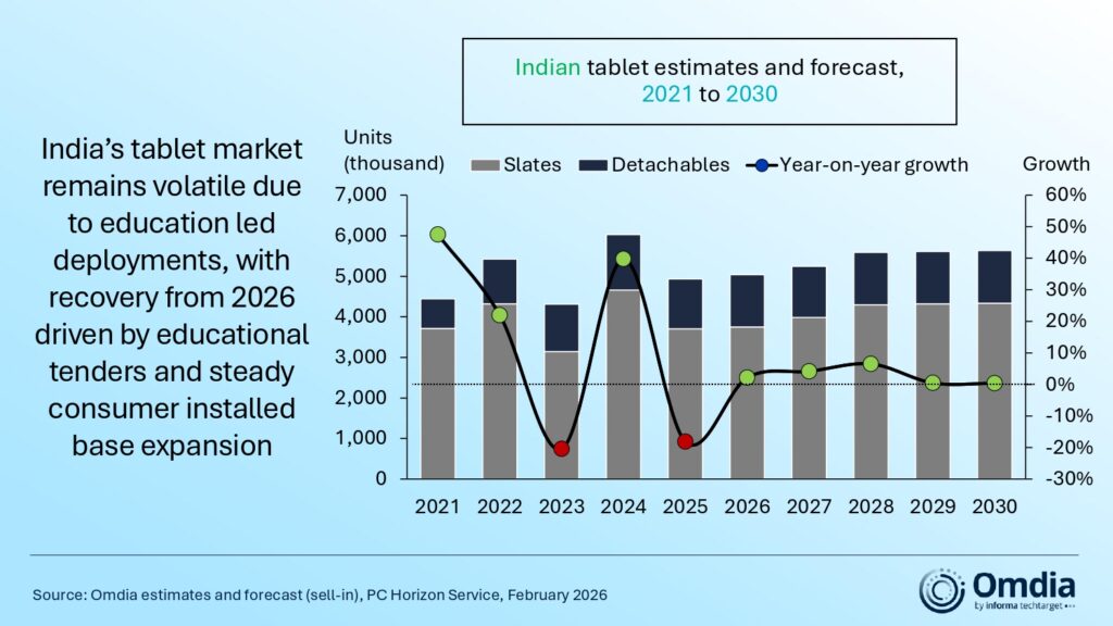 “The outlook for 2026 remains cautious as supply-side pressures and rising component costs begin to affect device affordability and availability,” said Ashweej Aithal, Senior Analyst at Omdia. Memory and storage prices increases are especially impactful, but even processor and GPU costs are expected to rise, restricting PC shipments to 14.3 million units, a 9.8% decline from 2025 levels as the market normalizes after record shipments. The tablet market is forecast to grow 2.1% to 5.0 million units, supported primarily by the anticipated execution of delayed education tenders.