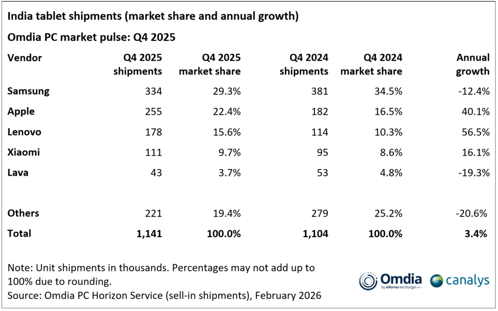 The latest research from Omdia shows that India’s PC market (excluding tablets) grew 17% year on year in Q4 2025, reaching 4.0 million units, driven largely by strong notebook demand. Notebook shipments reached 3.2 million units, growing 22%, supported by festive demand, strong online promotions, and year-end inventory push across retail and e-commerce channels. Desktop shipments grew 2% to 871,000 units, supported by steady enterprise and institutional procurement. The tablet market also recorded modest growth in the quarter, reaching 1.1 million units, up 3%, as consumer demand and promotions offset weaker education deployments.